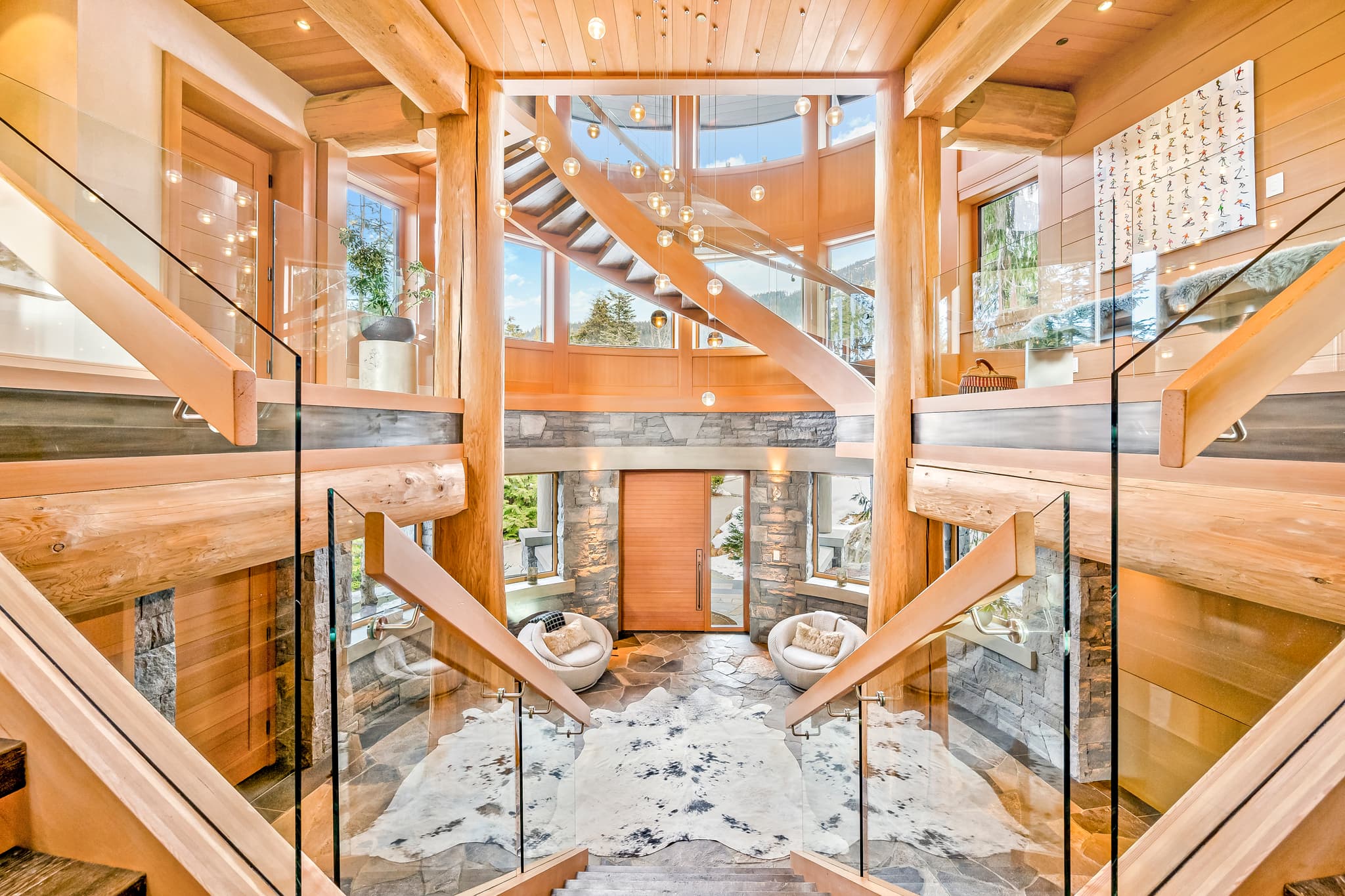 A true entertainer's dream. Located in Kadenwood, this 8-bedroom architectural delight accommodates up to 17 guests across 10 beds and 7 baths. With expansive decks, multiple gathering spaces, and a wall of windows overlooking Whistler Valley, Panoramic Estate lives up to its name. Featuring an open-plan kitchen, multiple indoor fireplaces, a ping pong table, a sleek hot tub, indoor sauna, basement media room, built-in sound system, and private elevator access to all levels, this is the ultimate retreat for large groups or multi-gen families looking for a luxury yet log feel of a classic ski resort.
